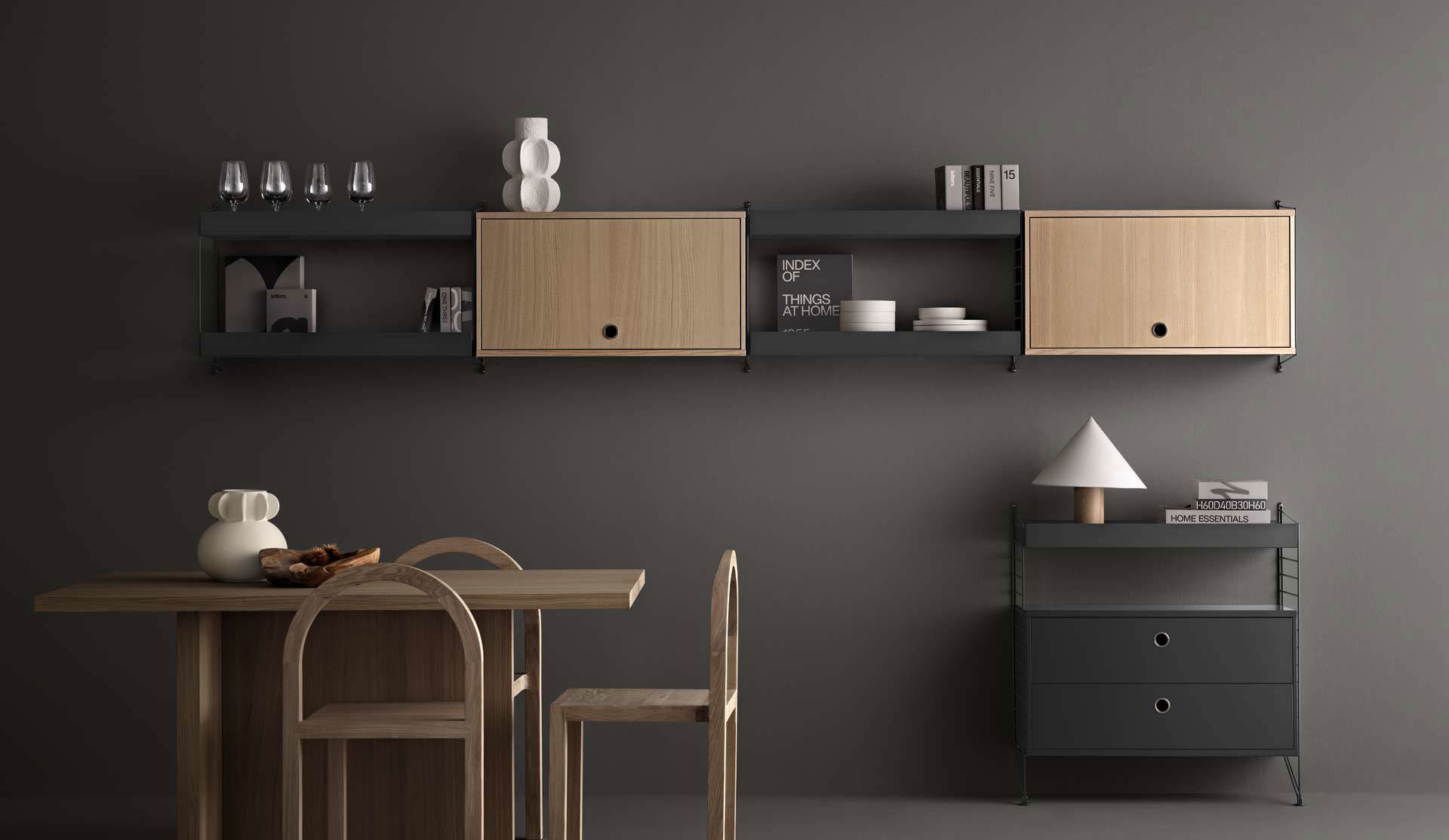 Edelleen, yli 60 vuotta myöhemmin, String on nerokas, elämäntilanteiden ja kodin mukaan muuntuva säilytysratkaisu. String-hyllyn voi koota tarpeidensa ja tilan mukaan tikasmaisista sivupaneeleista, erikokoisista ja -syvyisistä hyllylevyistä, kaapistoista ja laatikoista. Elegantti hylly näyttää hyvältä seinällä tai kokonaisuus voi seisoa lattialla.